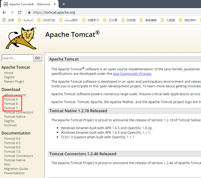 1、打开官网,在左侧选择要下载的版本,比如下下载Tomcat8:https://tomcat.apache.org/download-80.cgi