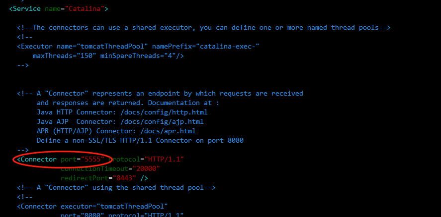3、默认端口是8080,如果要修改端口,可以修改:./conf/server.xml 文件中的端口,比如我们想修改为5555 ,则如图: